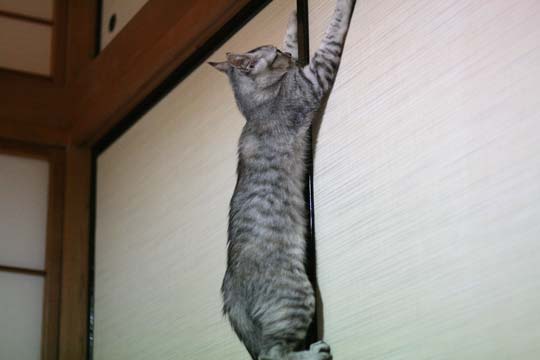 おっと、始まった。ガリガリガリガリッーの垂直ふすま登りの術。