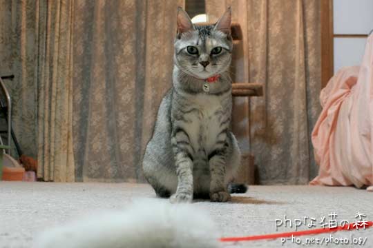 フワフワ&ポンポンをくわえてきて、ぽとりと落とし、3歩下がって。