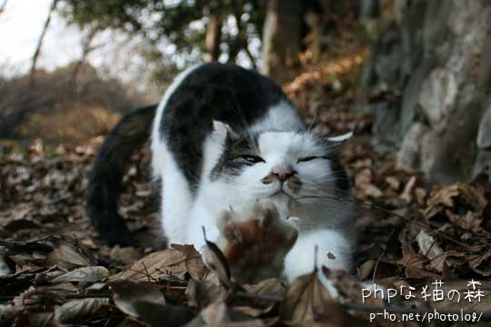 で、散歩といえば猫の森である。今日も北門の外でミミちゃん。 みるきー、別ミ、ちゃも、チビちゃんも北門外におった。 駐車場とはいえ、自動車が通るので園内にいたほうが安全なのですが。