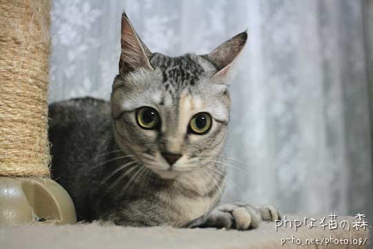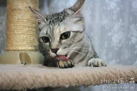 タワーで遊んでいたちぃちゃん。急に毛繕いを始めた。