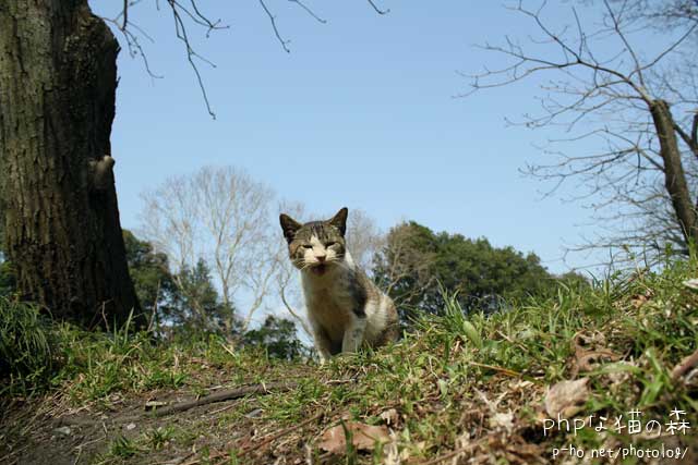 中央の丘に登ると、管理のおじさんたちが落ち葉の掃除をしていて、猫っこひとり見あたらなかった。 そこへしますけが出てきてくれた、嬉しいよぉ。 すっかり仲良しになったしますけを抱っこしてお尻をのぞくと、…ある。 また勘違いしていたようだ、しますけ男の子です。