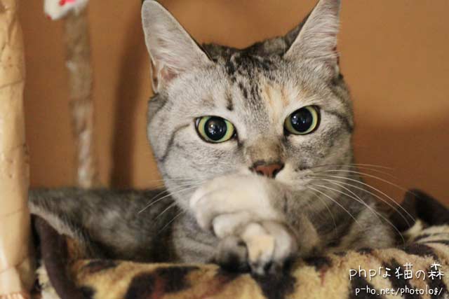 ベッドで毛繕いをするちぃですが
