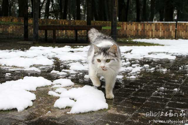 こちらもまだ雪が残っているうちにと、猫の森。