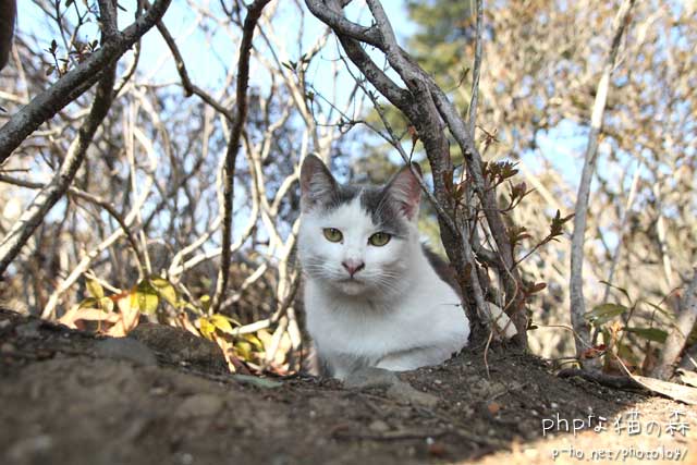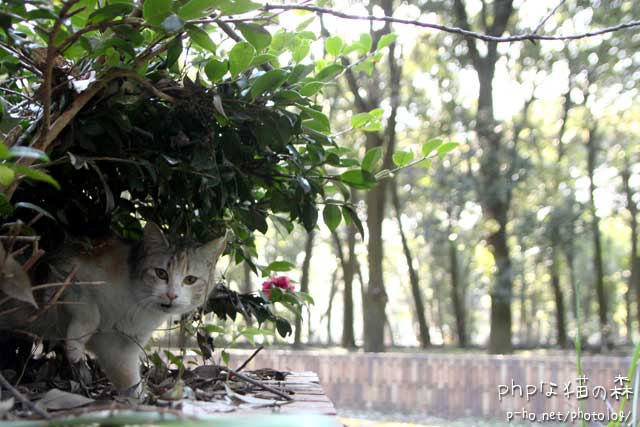 猫の森では、おじさんがいた丘の植え込みの中からとーちを呼ぶ声が。 ヒミケひさしぶり^^。枝が入り組んでいてなかなか出てこられなかったの。