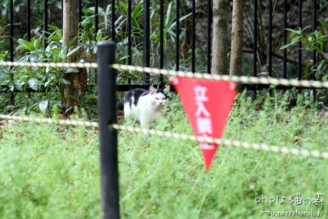 立入禁止だというのにブチ。猫ちゃんにその字を読めといっても無理。