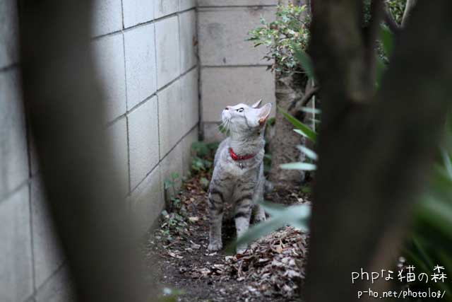 「登りもしないうちから怒らなくたっていいじゃない。ちょっと鳥さんの声がしただけ、 脱走なんかしないわよ。だいたい逃げる時はとーちを撒いてからに決まってる。 今からダァーと走ればとーちはついてこれないのは分かっているけど、 あえてそうしない今日のあたしは脱走する気分じゃないのよねー。」