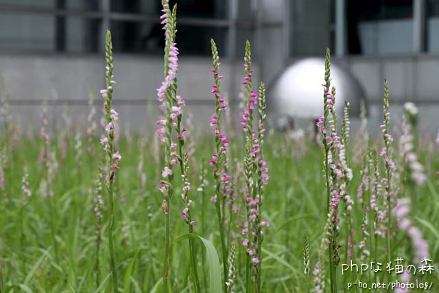 ネジバナが群生しているそのむこう
