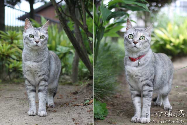 ウチでは、ばあちゃんの目をぬすんで脱走した悪いちぃ。(左) とーちに付き添われて散歩する良い子のちぃ。(右)でした。