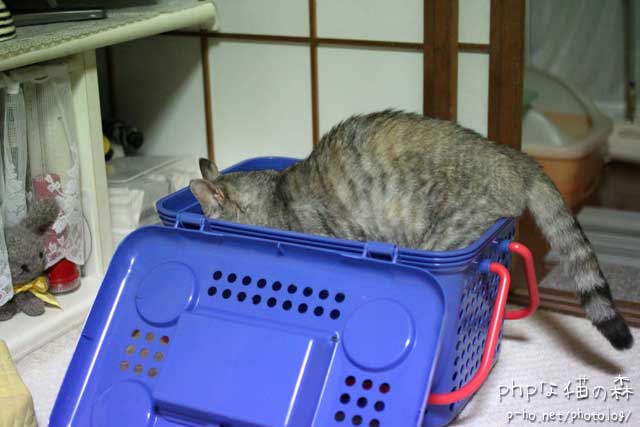 ちぐさ捕獲作戦中だった土日に持ち歩いていたバスケット。 部屋に放置しておいたら入った。^^;