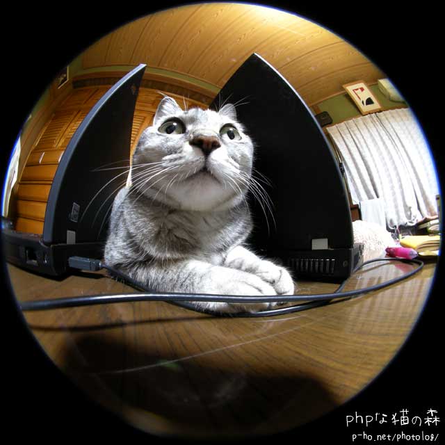ThinkPadの隙間ですっかりまったりモードになったちぃを、魚眼レンズで鼻デカ。