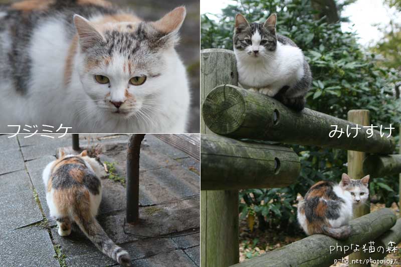 先週“もうひとりの猫おばさん”とお会いした時に「しますけ、さばすけとフジミケは兄妹」説を 自信をもってお話されていたので、ふと私は“みけすけ=フジミケ”ではないかと思い当たり みけすけの唯一の画像(右)と同じアングルでフジミケを撮ろうとしたのでした。 同じアングルは無理でしたが、左下が今日撮った画像、左上は在庫から。 こりゃ、同一猫ですね。いままでまったくその線は考えもしませんでした。(汗
