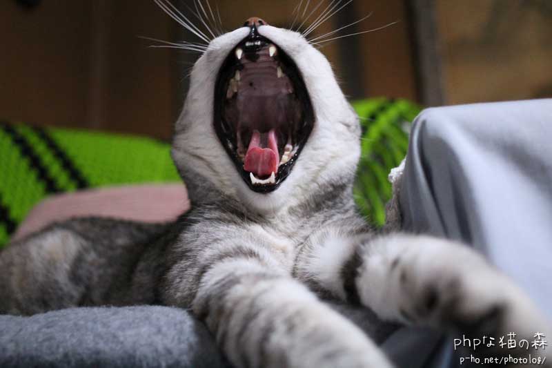 「食べたら遊ぼうよー!」と大あくびの図ですが、あれれ、なんか歯が足りないように見える。