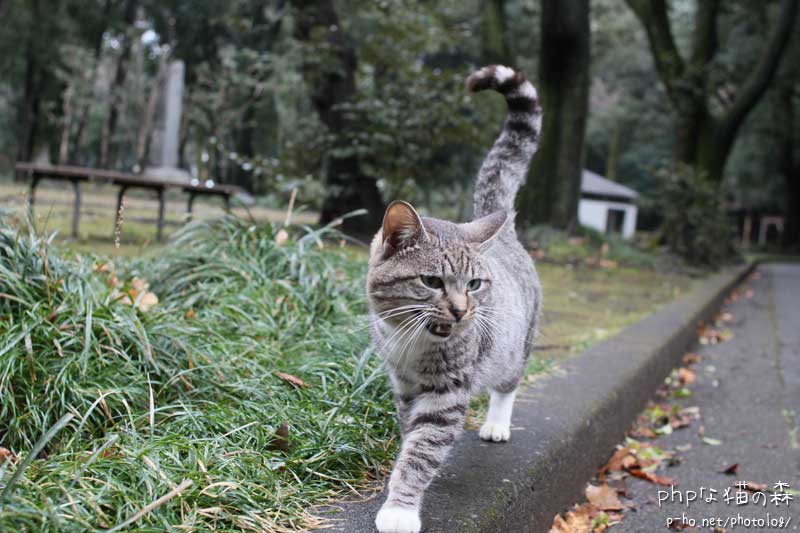 婚活で(?)東奔西走しているしますけくん。今日はここ、銀杏トイレが見えるベンチの上で 小降りにはなったけれど雨に打たれていた。 しっぽのカーブ具合がステキです。