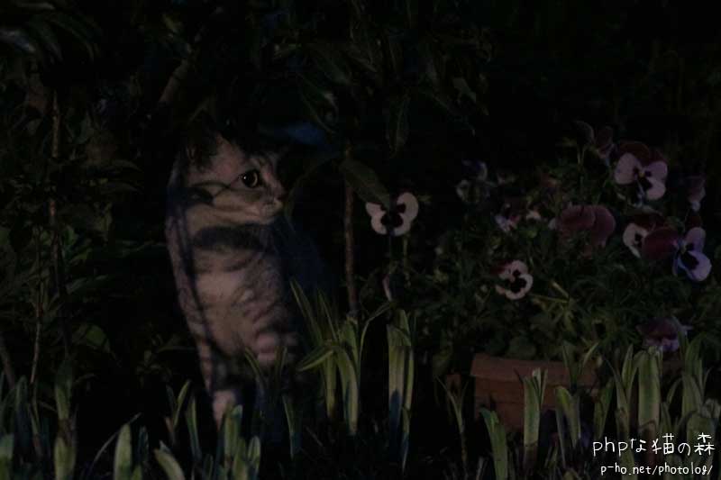 防犯灯の灯りで発見することもあるのだが、鬼ごっこのつもりかすぐに隠れてしまう。 しばらく放っておいてから、ペティオのぷろぺらを持って出たままんが連れて帰りました。