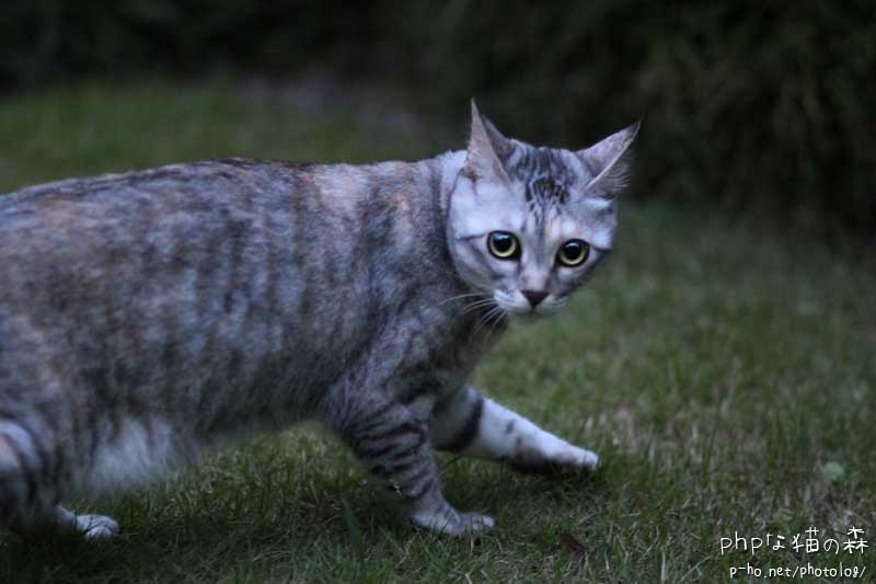 かなり暗い中でもチョウチョを捕まえ(手の下)、とーちに取られないように警戒しています。