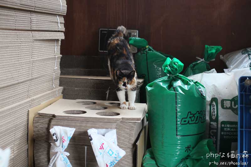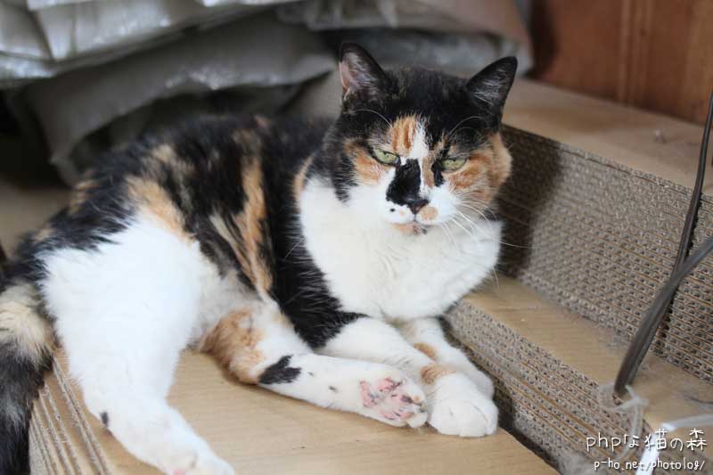 に寄りながら実家です。倉庫に積んだダンボール上がお気に入りスペースなみーこさん。