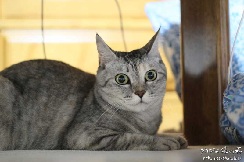 やっとおさまったというのに、またいつ来るかもしれないのでテーブルの下。 挙動が怪しい猫なのです。