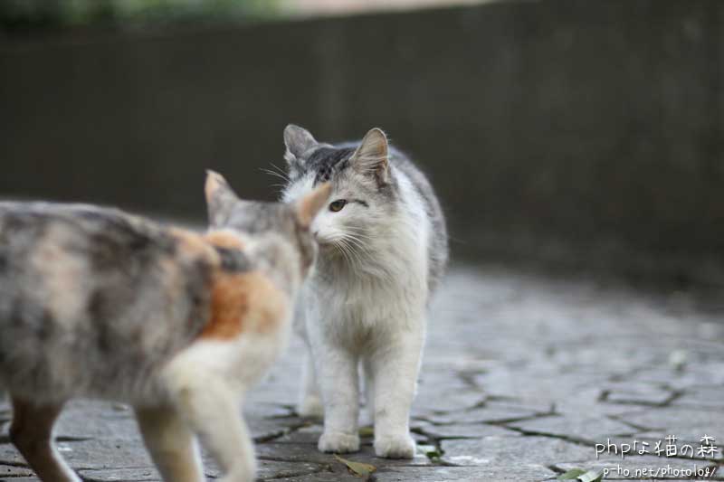 私は森へ行くのですが、長居する気がないのでほどんど素通り。 みーみけ一家が点々と並んで道行く人を見ていましたが、ピントはみーみけの背中からお尻。^^;