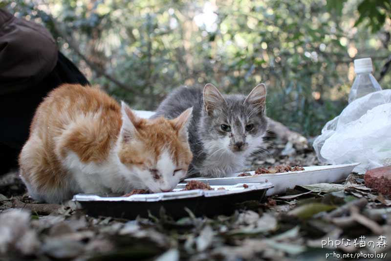 最近捨てられた2匹が秘密の猫道に居ついたようです。第6の猫おばさんが、かいがいしく面倒を見てくださっている。