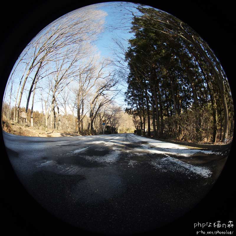 未明の雪も起床時、こちらでは残っていなくて、雪を求めて北へ走る。 今日一番の雪道(日影)。