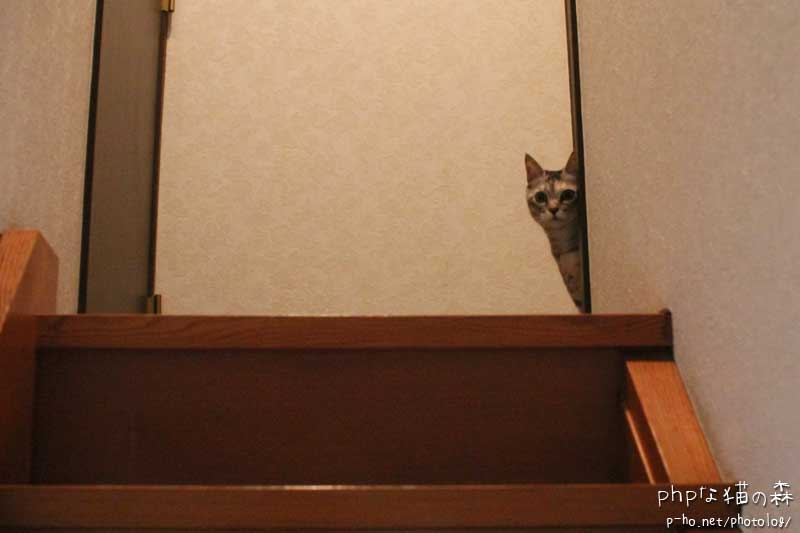 あまり登場しないけどウチには2階があって、高いところが好きな猫だから当然1階より2階のほうが好きそーに思いますが 実際はほとんど2階まで上がることはない。上にはにーたん、ねーたんの部屋と納戸があるだけだしね。 鬼ごっこをしていて階段を駆け上がった時でも、このへんで止まって様子を見る。「追いかけて来いにゃー」。