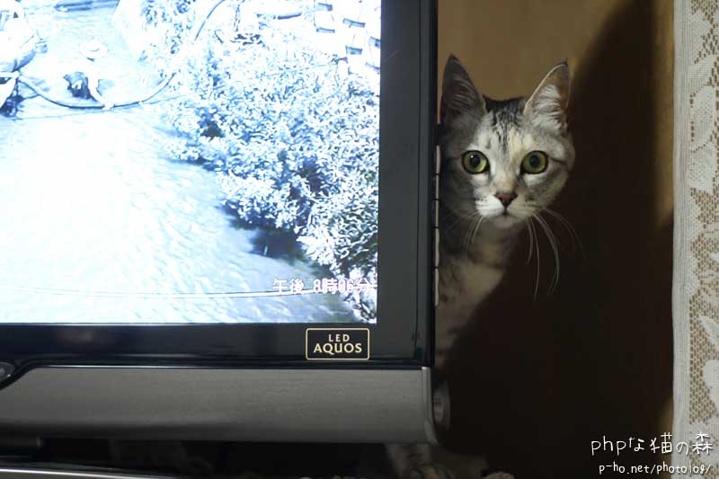 「早く向こうで遊ぼう」とばかり、テレビの脇から顔を出します。