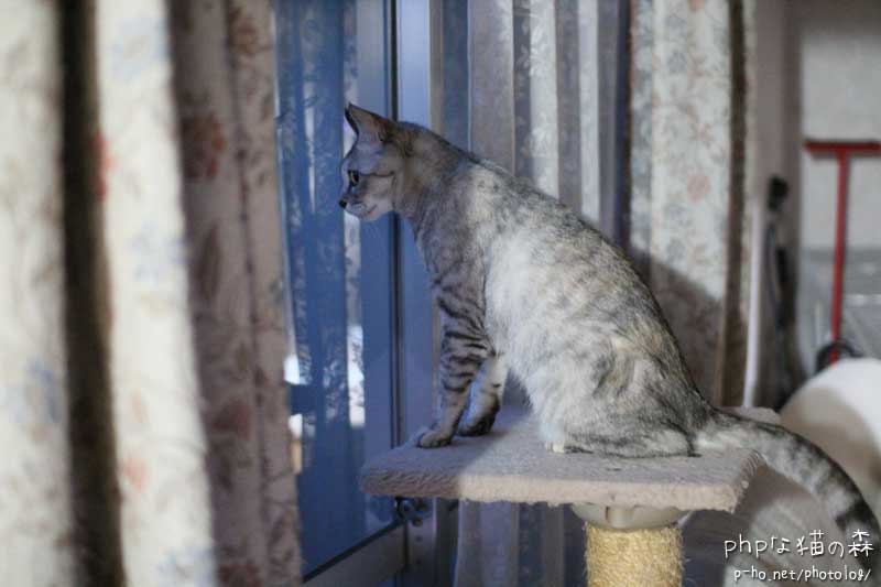 最近の定位置は窓辺の旧キャットタワー。外の様子を監視している。