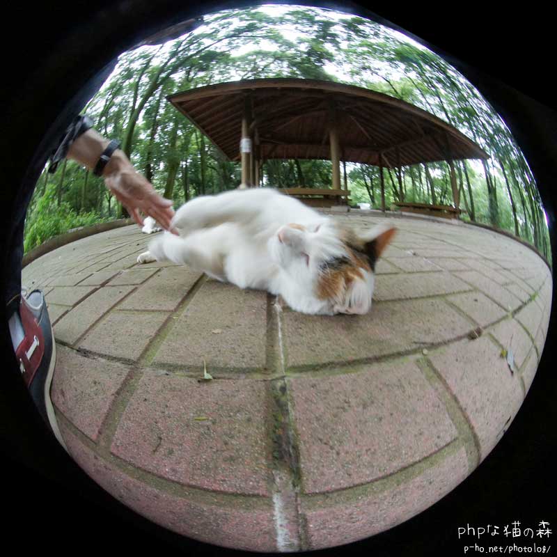 あずま屋の丘でロボミケ。この子、正面からだと白が多すぎて、三毛猫として見映えが寂しい。