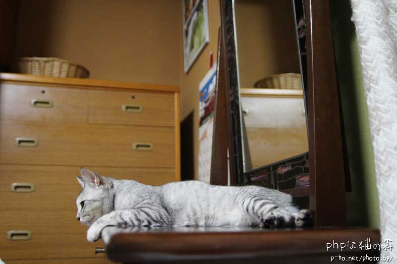 寝ぼけてベッドごと落ちたのか、あるいはドレッサーから飛びそこねてベッドにつかまって落ちたのか、