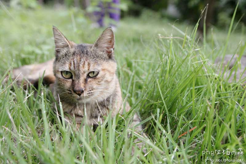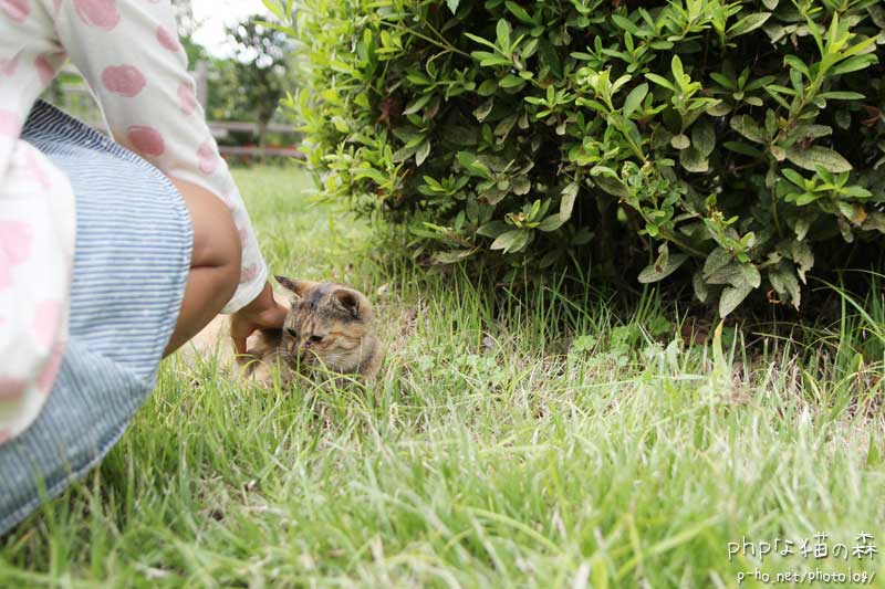 お墓参りを済ませた後、森に行くと、2つ目の橋で女の子と遊ぶ見知らぬにゃんこ。