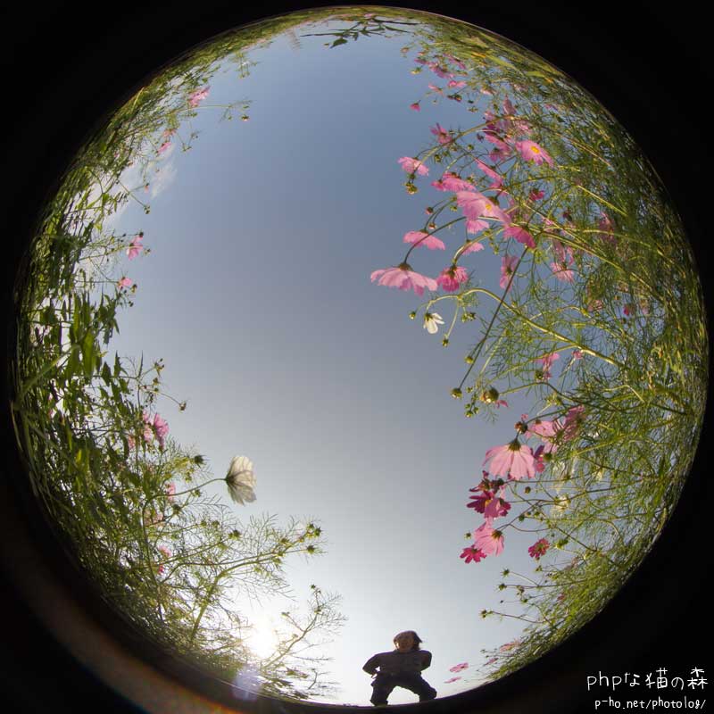 休耕田を利用したコスモス畑で自分撮り。これも逆光だわ。
