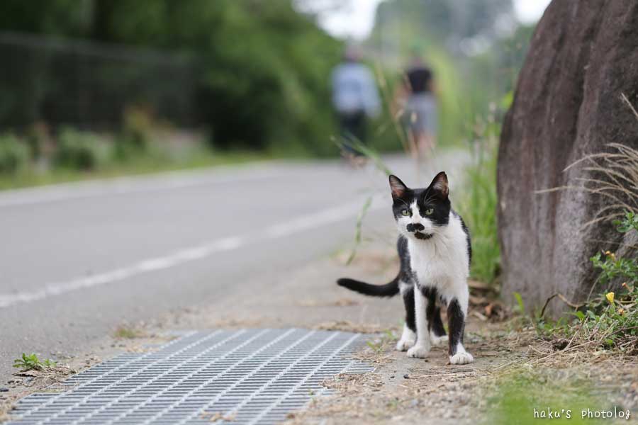 古墳の公園。古代住居エリアに向かう途中、ヒゲのぶちちゃんに会う。