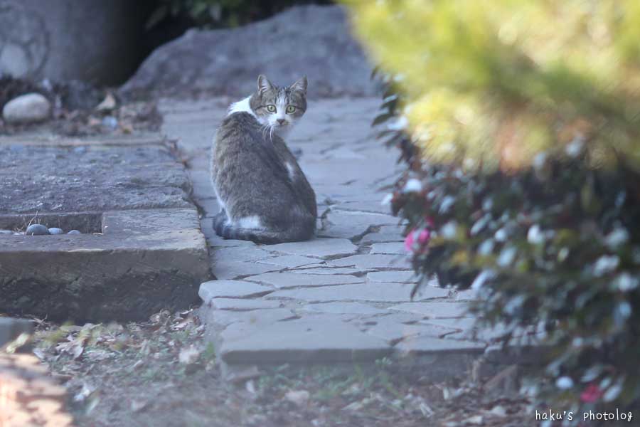 線路沿い、道沿いのお宅の庭には、「玄関開けてくれにゃー」と言う猫さん。