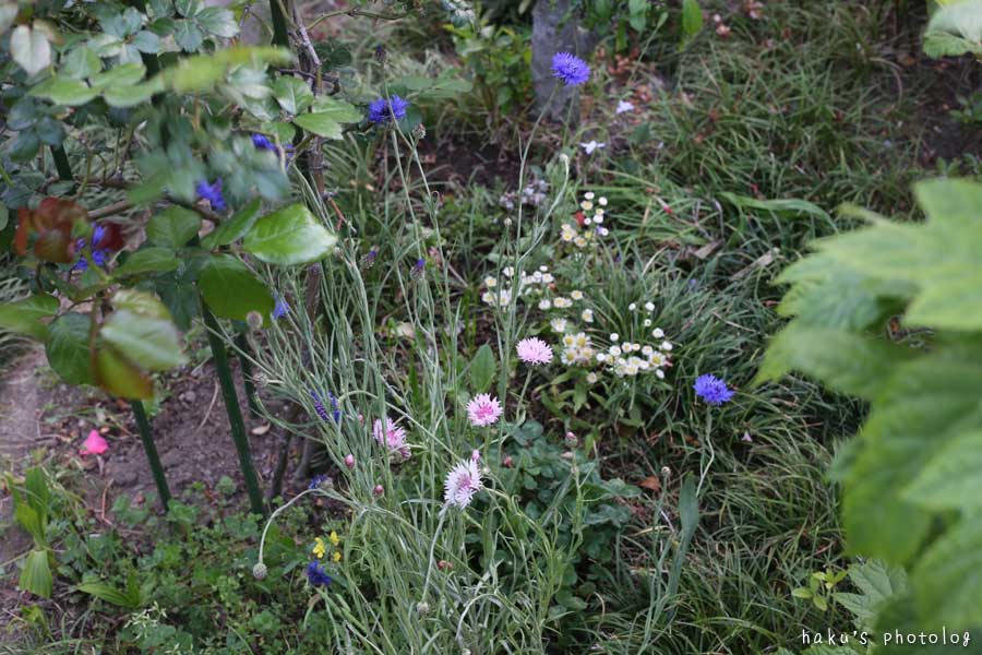 オレの野の花コーナー。烏川の土手でいただいてきたヤグルマギクが元気。