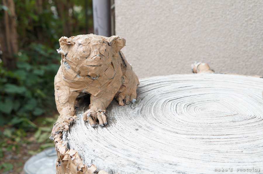 新聞紙とガムテープの切り株に新聞紙とガムテープの生き物。