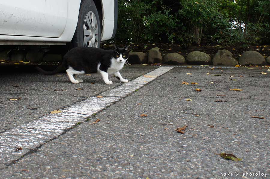 駐車場でハチワレちゃん。