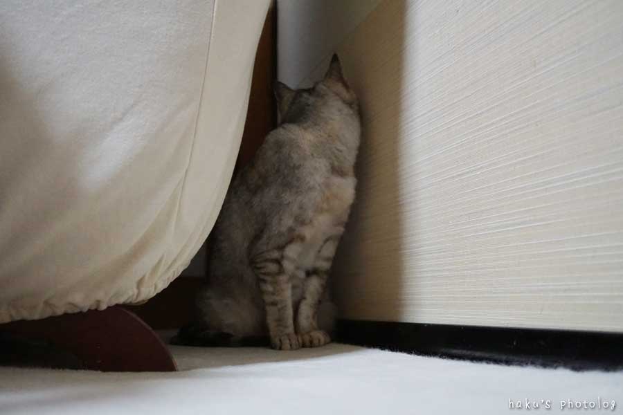 こちらは一昨日の雷が鳴った時、ソファーの後ろで襖に顔をつけて固まるちぃ。