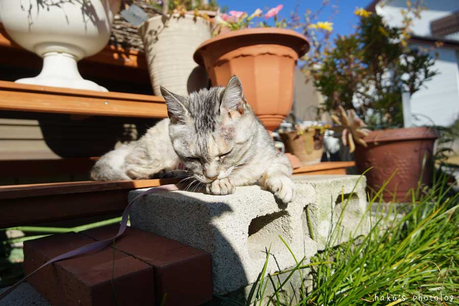 だいぶ寒くなりましたが、日中ほとんどの時間このあたり、紐の届く範囲でまったりしています。