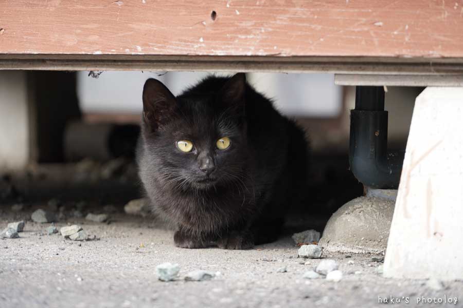 うどん屋さんの床下に小さなクロちゃん。今年生まれた子だな。