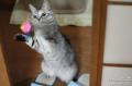 長期ブームな羽の猫じゃらしですが、ぶーんぶーんと振っていると棒と羽をつないでいるヒモがよじれて短くなってしまう。 棒の先に羽がついているのと同じ。^^;