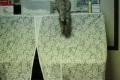 この季節、帰宅した時、ちぃの玄関へのお出迎えがないことがある。ちょっと寂しい。そーゆー時はたいがい コタツにもぐっていて外の音が聞こえない、あるいは夕食の後、台所のテーブル下の暖かいところでまったりしている のどちらか。今日はテーブル下と読んで、カメラを構えながらドアを開けた。