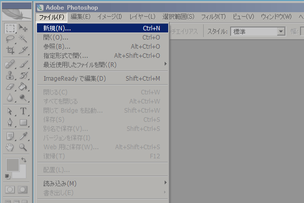 その時、レイヤーウィンドウは出ていますでしょうか。 見あたらない場合は、〔ウィンドウ〕→〔レイヤー〕で出しておきましょう。 〔背景〕レイヤーの上に〔文字〕レイヤーがあるはずです。 〔背景〕レイヤーを選択した状態でファイルをPhotoshop形式で保存しましょう。(拡張子 .psd) これが基本となるファイルになります。