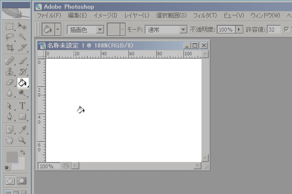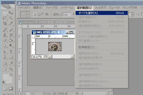 ここで、先ほど文字を入れたほうのファイル(ウィンドウ)に戻り、 〔レイヤー〕ウィンドウで背景レイヤーが選択された状態で〔編集〕→〔ペースト〕すれば出来上がり。