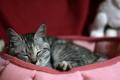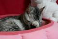 そうそ、ピンクのベッドですがちゃんとベッドだと認識してますよん。 てか、いつも寝ているソファーの上に置いたからですが。 昼間はベッドをくわえて引きずり降ろしていました。