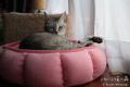 散歩がすむとひと休み。珍しくピンクのベッドに入ったけど表情は不本意。