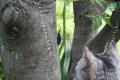 またまた雷雨ですねー、てか停電するし雹(ヒョウ)は降るし。 写真はまだ降る前に、蝉が飛び立った木を覗き込むちぃ。