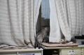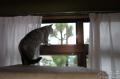 カーテンの後ろに避難。暑いのはもちろん苦手だけど、冷房はもっと苦手なのです。